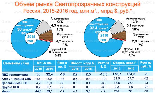 В 2016 на рынке светопрозрачных конструкций был отмечен спад продаж пластиковых окон. Это было самое «черное время» для конструкций ПВХ и компаний по продаже и монтажу. 20% из них обанкротились и вынуждены покинуть рынок. В цифрах это выглядит так: в 2015 году установлено 44,8 миллиона м2 СПК, в 2016 — 39,3 миллиона м2. В рублевом эквиваленте продажи сократились на 13%. Но все уже позади. За 3 месяца 2017 года рост доли изделий составил +2%.
